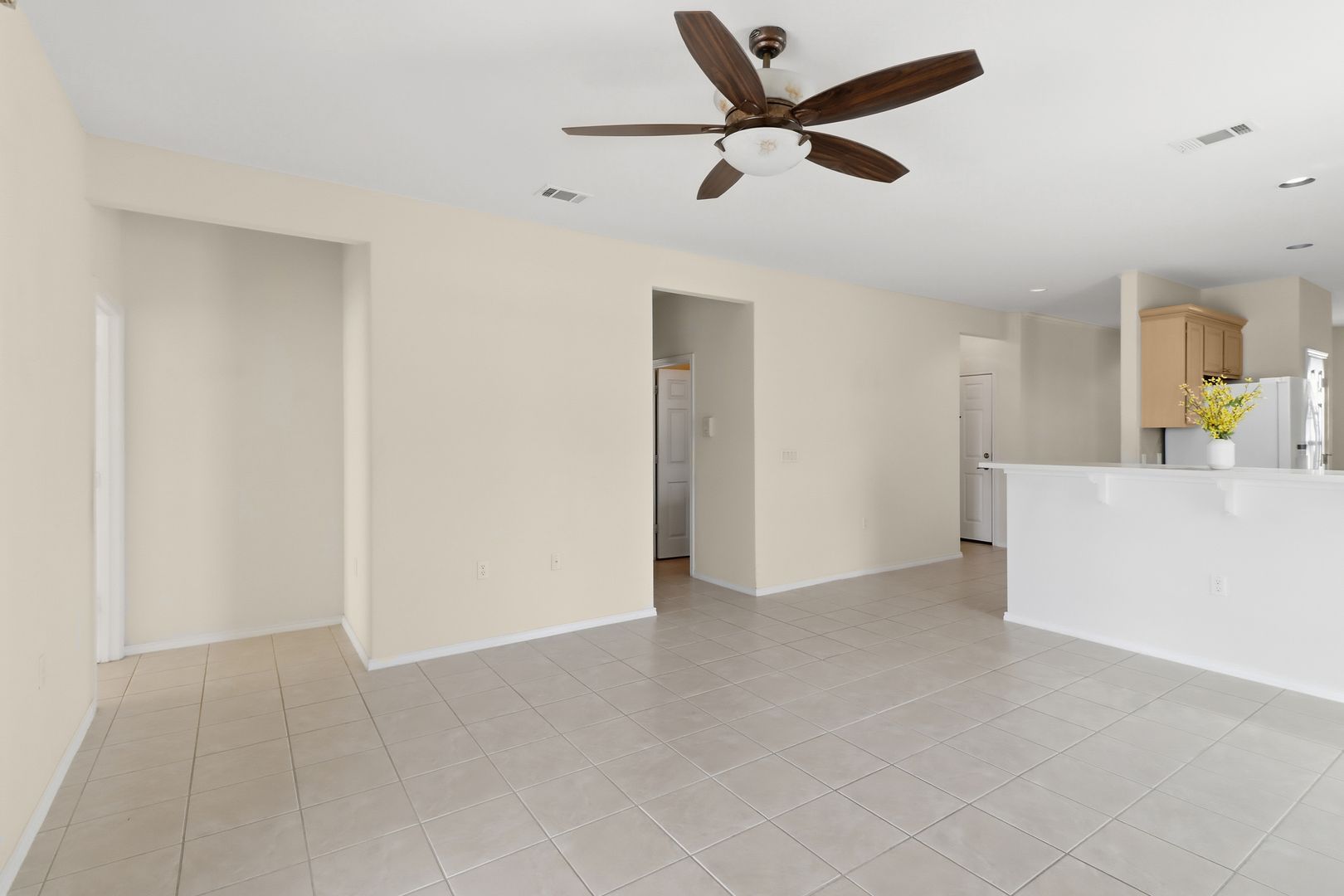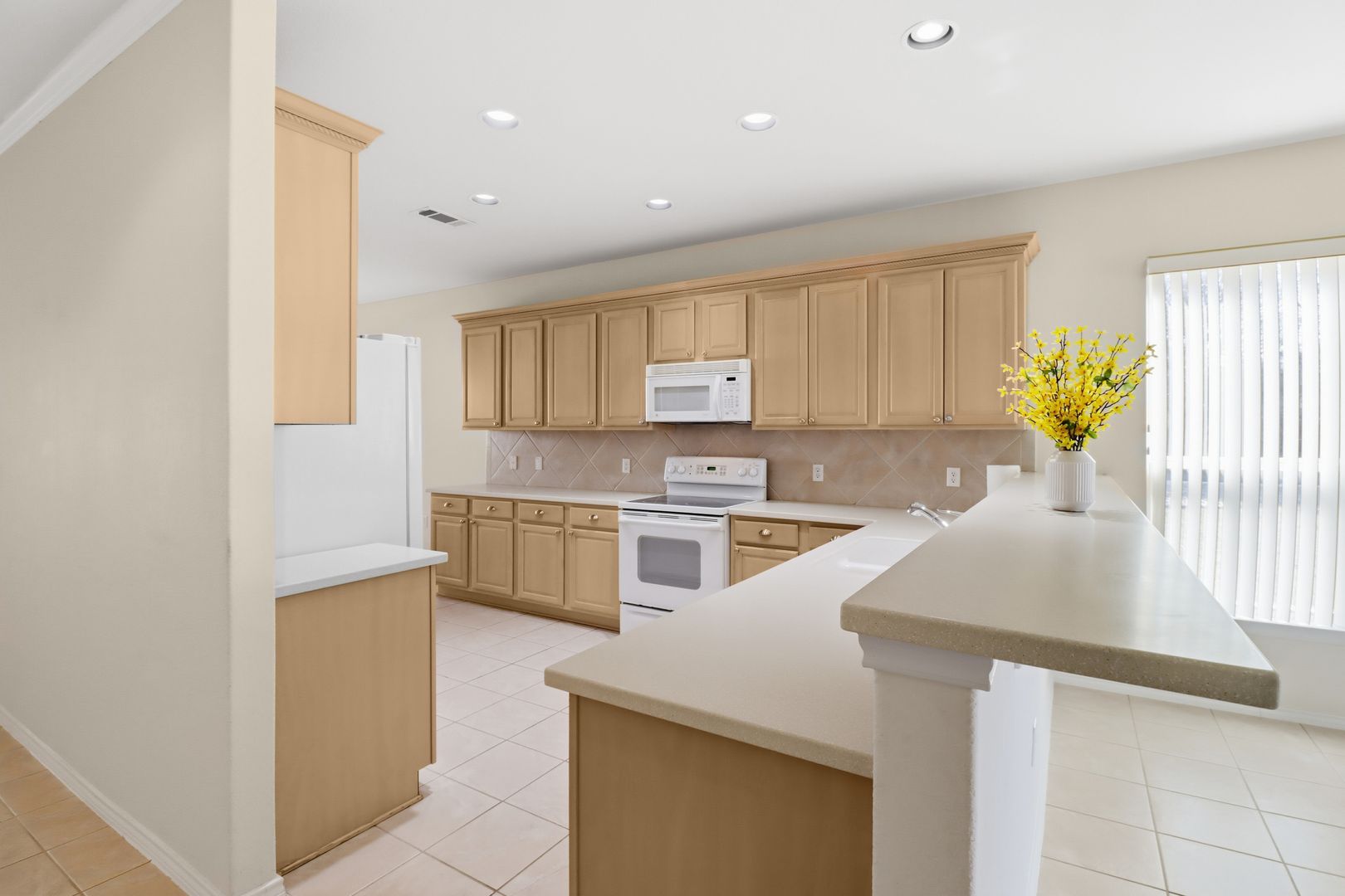 Nestled in the heart of Sun City, on a gorgeous lot with peaceful greenspace views, this charming Bayberry floor plan provides 1597 square feet of comfortable living with 3 bedrooms and 2 bathrooms. The open floor plan is perfect for entertaining and interacting with guests, creating a seamless flow between the living spaces. Hard flooring in the main living areas and bedrooms provide convenience and easy up keep. The kitchen offers Corian countertops, electric range/oven, white and stainless steel kitchen appliances, pull out shelving and an abundance of cabinetry and counterspace. Relax and unwind in the spacious primary bedroom that includes an en-suite bath with dual vanities and a walk-in shower. Guests will enjoy their own space with easy access to the guest bath that features a vanity and bathtub. The additional bedroom allows flexibility to be an at home office, work out space or hobby room. Enjoy BBQ's with your neighbors or admire the beauty of the greenspace on the back patio that is partially covered with an extended area that is uncovered. Additional features of this property include ceiling fans, utility room and storage cabinets in the garage. The minimum lease term required is 12 months.