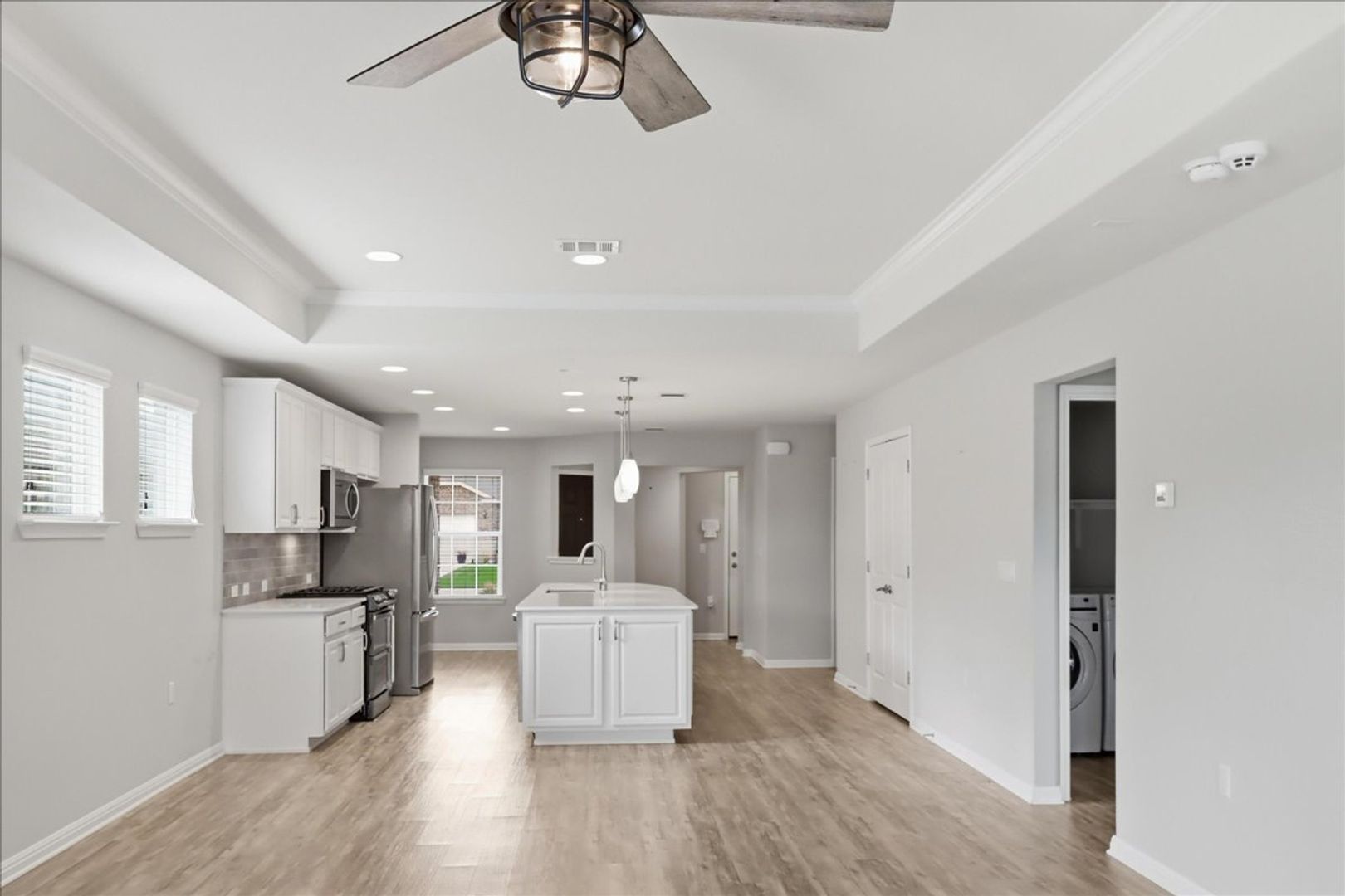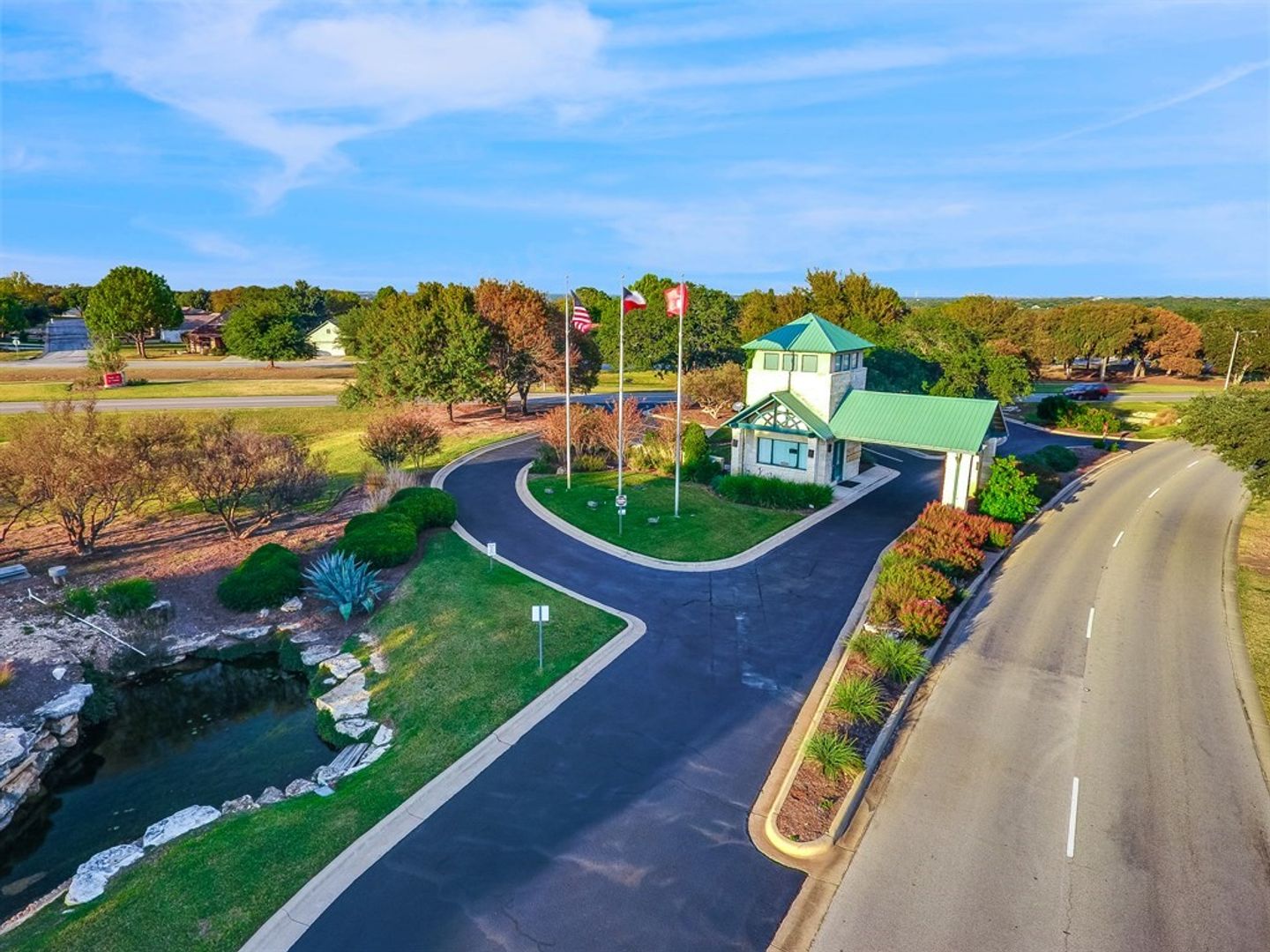 Located less than half a mile from the Retreat Activity Center, this beautifully maintained Steel Creek floor plan offers a bright open floor plan with beautiful hard flooring through the main living areas and primary bedroom. Carpet in the guest bedroom for added comfort. The kitchen is the heart of the home, featuring stainless steel kitchen appliances, a gas range, lovely white kitchen cabinetry and a large island that flows seamlessly into the living space. Tray ceilings in both the living room and primary suite add architectural charm and an elevated feel. The bright sunroom provides a relaxing space filled with natural light creating the perfect spot to relax with morning coffee or a good book. The primary bathroom includes a dual vanity, walk-in shower and spacious walk-in closet, while the guest bath features a vanity and bathtub for visiting friends and family. Step outside to enjoy the extended covered stone patio and fully fenced backyard—great for entertaining or simply enjoying the Texas evenings. The minimum lease term required for this property is 12 months. Tenants are able to purchase a membership badge via the Membership Services Office for $100 per badge. Badges issued only to Tenants listed on the lease (2 badges max). The membership badges will provide Tenants access to the amenity centers and clubs here in Sun City just like Owners!